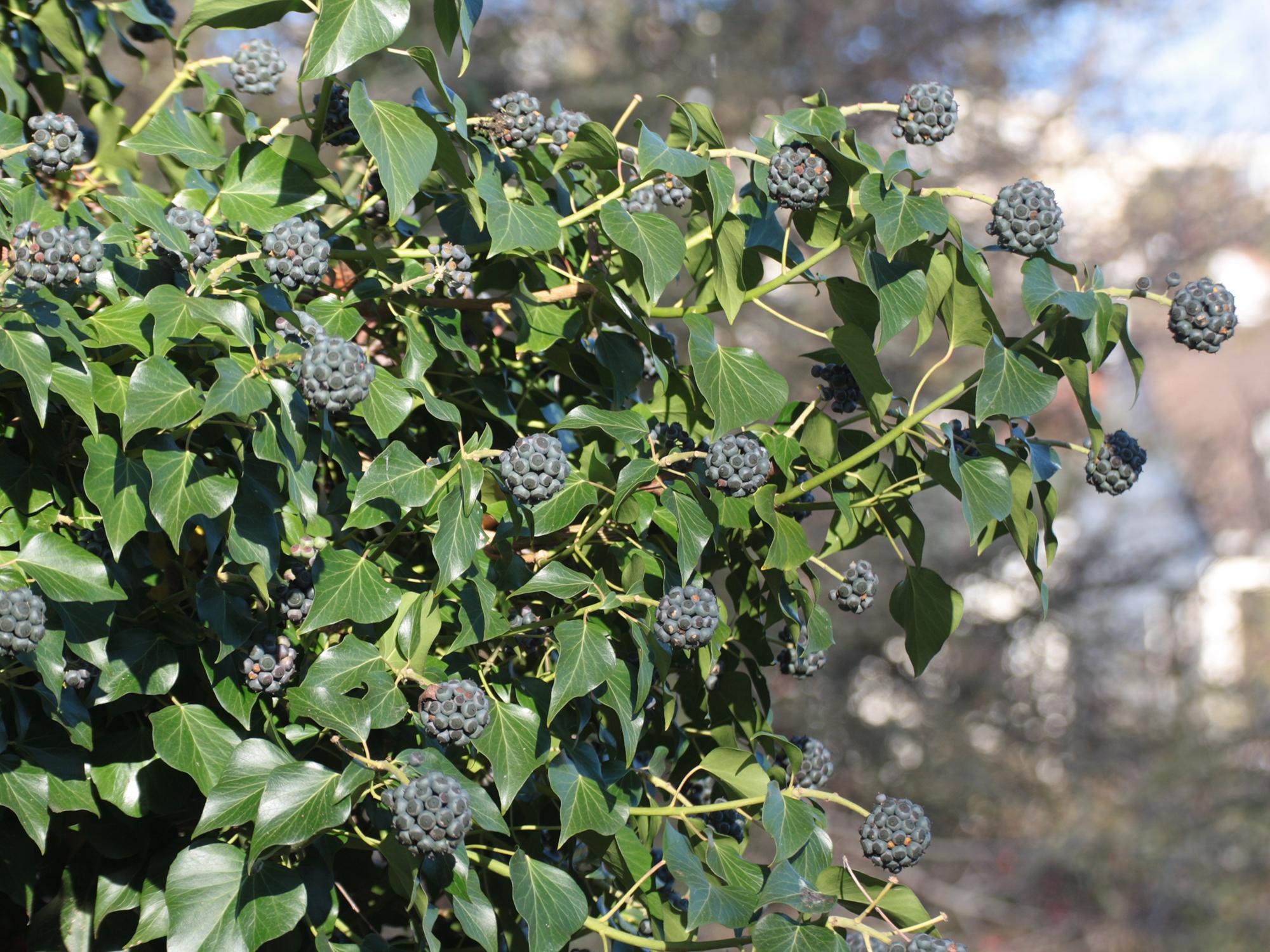 À l’automne apparaissent les rameaux fertiles aux feuilles d’un vert luisant, clair, en forme de losange, avec des fleurs en ombelle produisant un nectar bienvenu pour les abeilles et autres butineurs. Les fruits bleus-noirs mûrissent en hiver et au printemps et nourrissent les oiseaux (mais pas nous !).