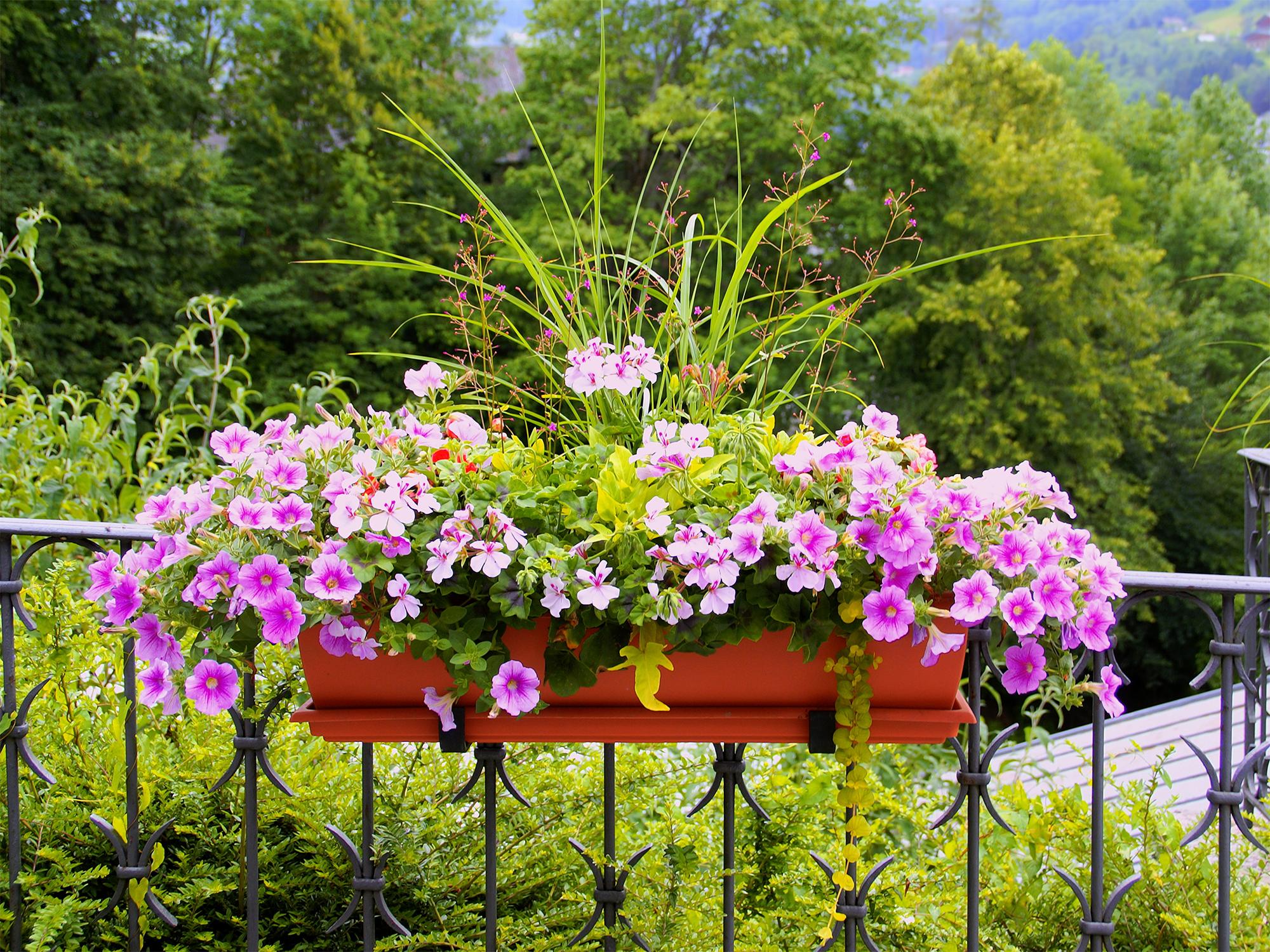 - Jardinière fleurie « plein soleil », portulaca orange, géranium balcon rouge, géranium vivace rozanne, lantana retombant blanc, euphorbe myrsinite.
